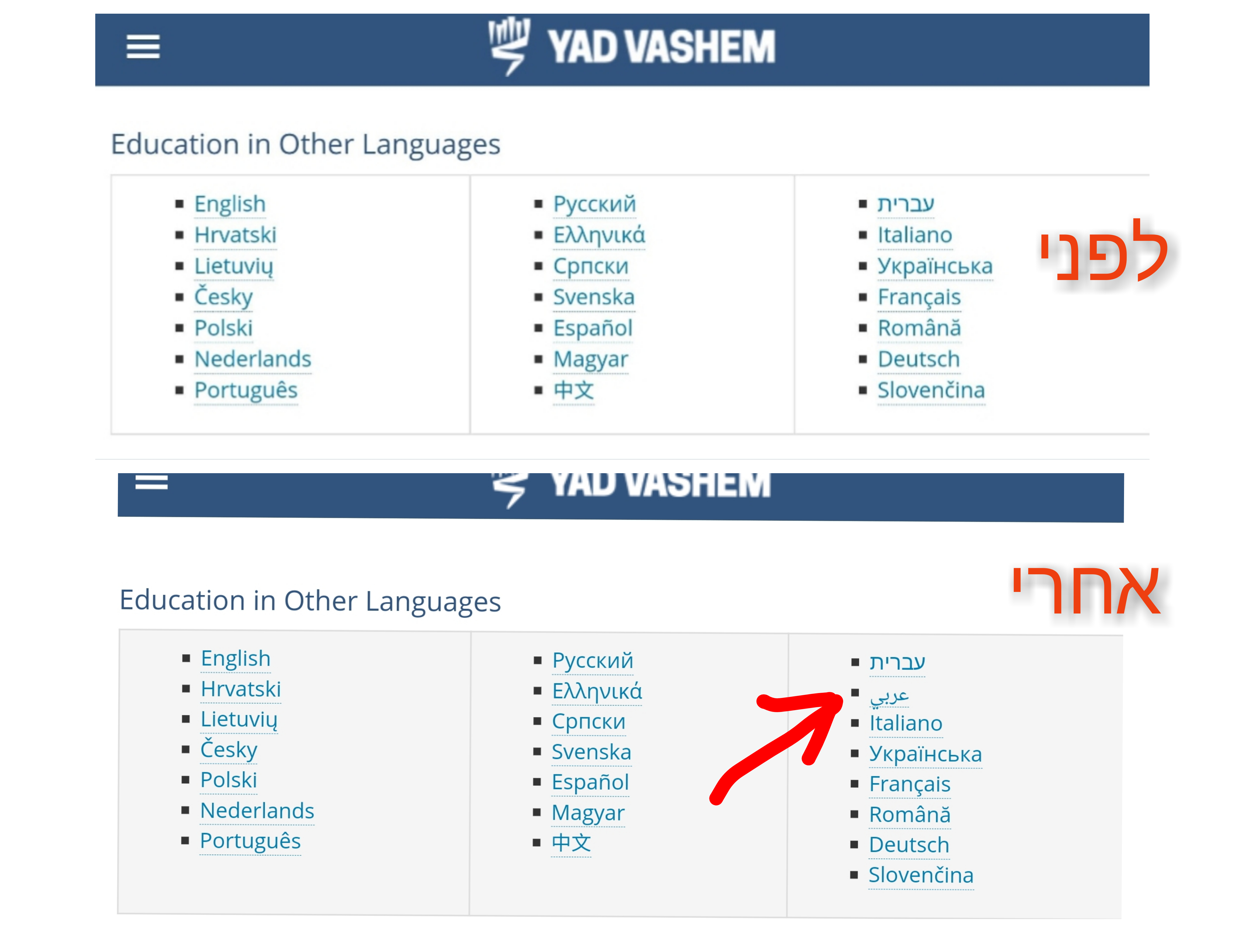 מיד יוסף חדאד מנכ"ל העמותה פנה בשם העמותה שלנו להנהלת יד ושם בנושא. זה היה תהליך ארוך אבל אנחנו שמחים לבשר שהצלחנו! היום באתר יד ושם יש תכנים חינוכיים מרוכזים ומותאמים גם בערבית!