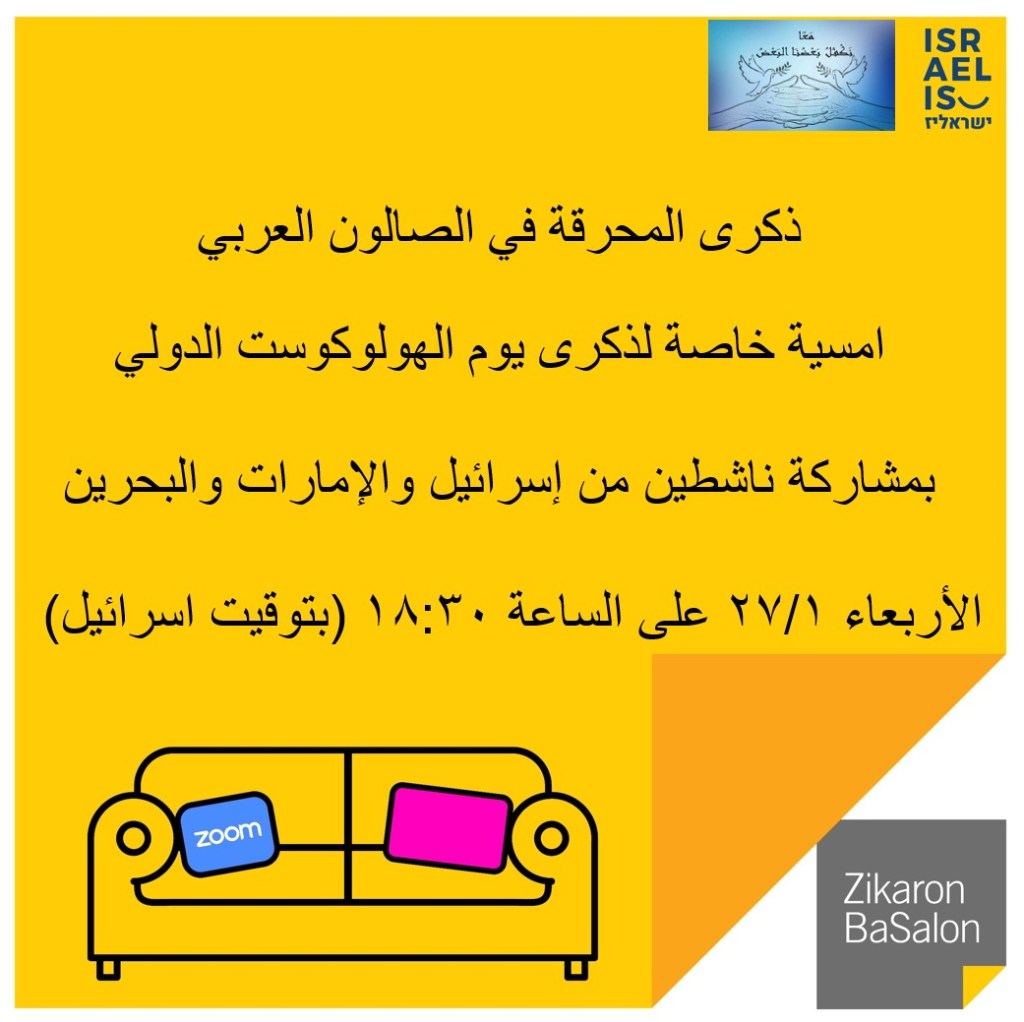 אחרי שהכנסנו את מיזם זיכרון בסלון לחברה הערבית-ישראלית בשנתיים האחרונות בהצלחה, כשבשנה האחרונה השתתפו מאות צעירים באירועים, ואחרי שהובלנו את יוזמת תרגום התכנים החינוכיים באתר יד ושם לערבית אנחנו שמחים להמשיך לפרוץ דרך בתחום ולקיים בעוד שבועיים ביום השואה הבינלאומי אירוע זיכרון ראשון מסוגו באמצעות זום עם עשרות משתתפים מאיחוד האמירויות ובחריין, שיפגשו עם אשת עדות ויקיימו יחד איתנו שיח משותף בערבית בנושא זיכרון השואה בעולם הערבי.