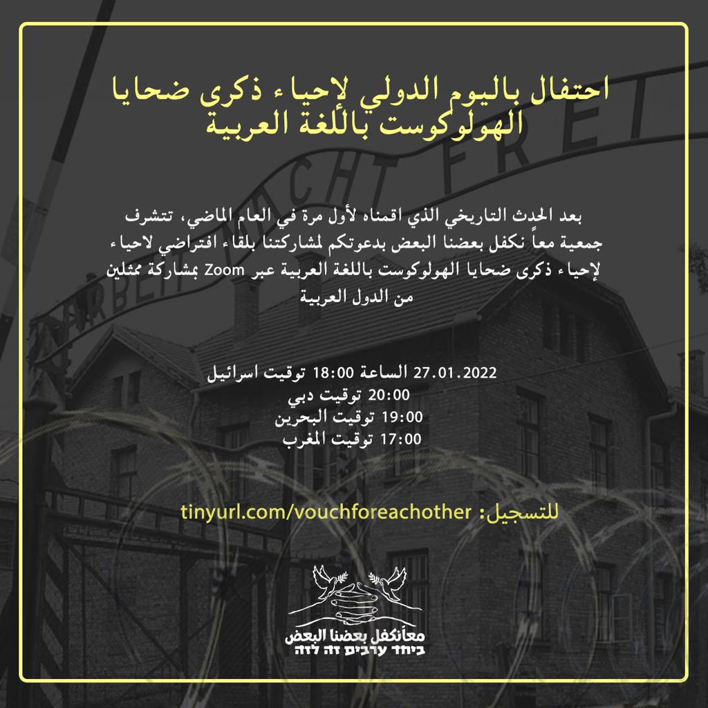 בשבוע הבא ביום השואה הבינלאומי (27.1) תקיים עמותת ביחד ערבים זה לזה אירוע זיכרון בסלון מקוון בערבית עם עשרות משתתפים בלוגרים ומשפיענים ממדינות ערב.